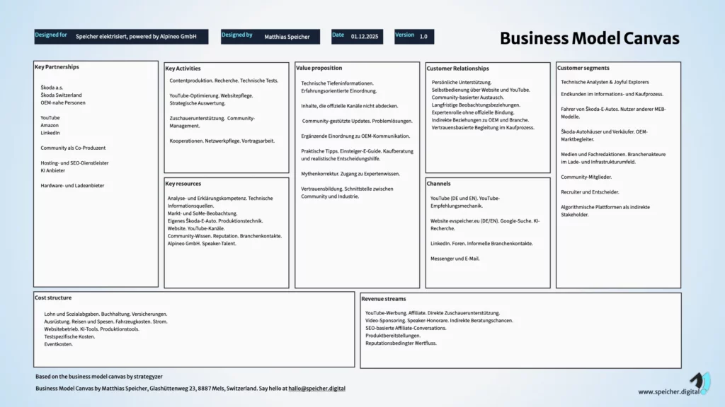 Ich setze das Business Model Canvas als strukturelles Werkzeug ein, um das Modell präzise abzubilden. Es ist ein fester Bestandteil meiner Arbeit, weil ich seit vielen Jahren digitale Produkte und Märkte über genau diese Modelle entwickle und steuere.