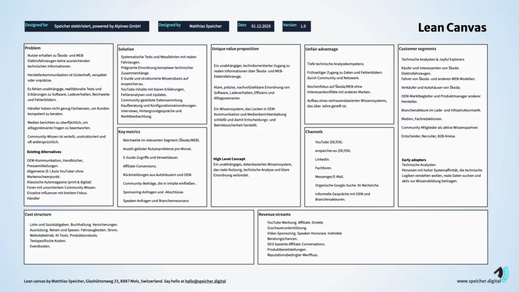 Dieser Beitrag beschreibt, wie Speicher elektrisiert heute strukturiert arbeitet. Er zeigt, wie das Projekt als Wissenssystem funktioniert und wie die einzelnen Bausteine des Business Model Canvas und Lean Canvas ineinandergreifen.