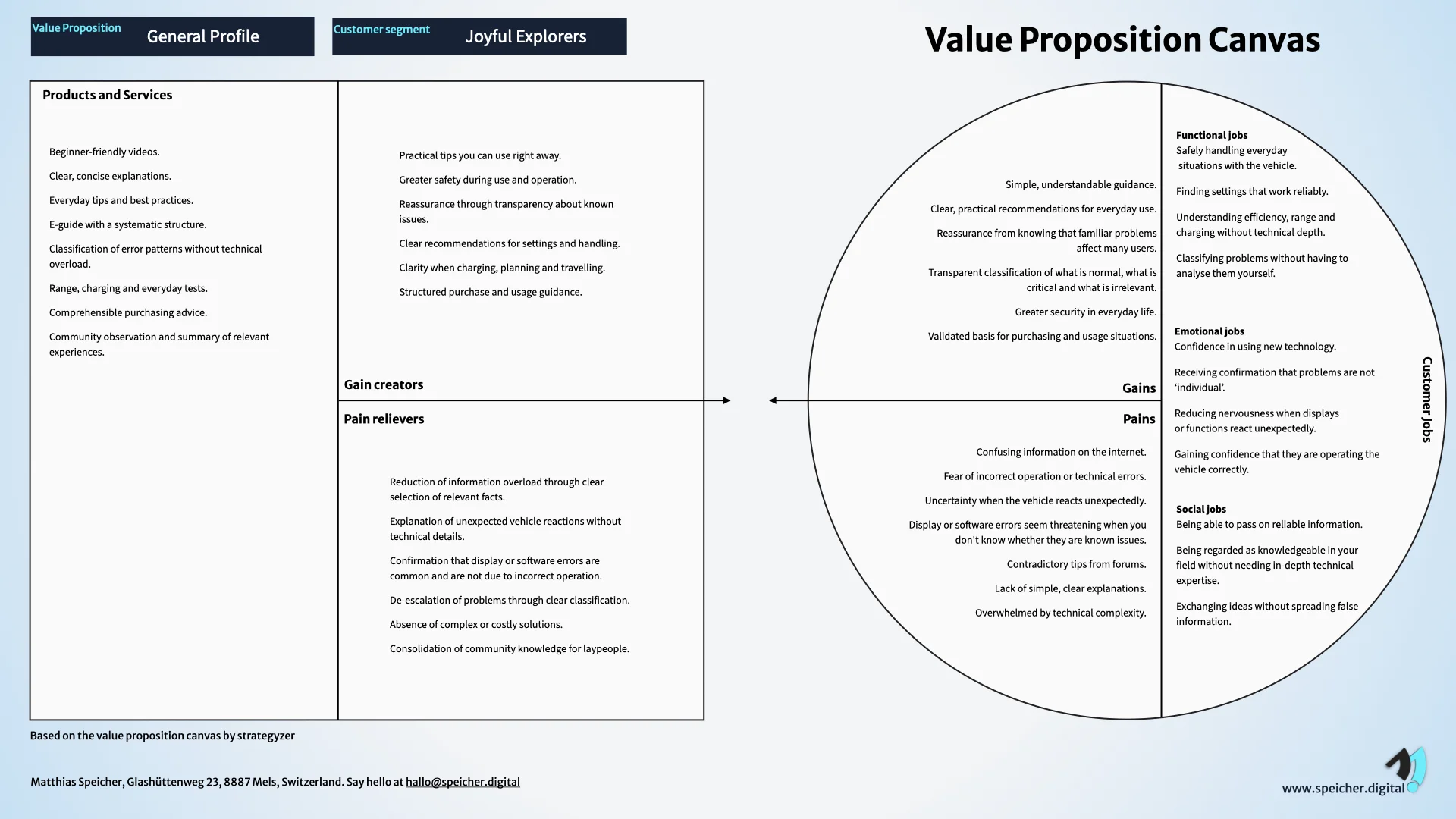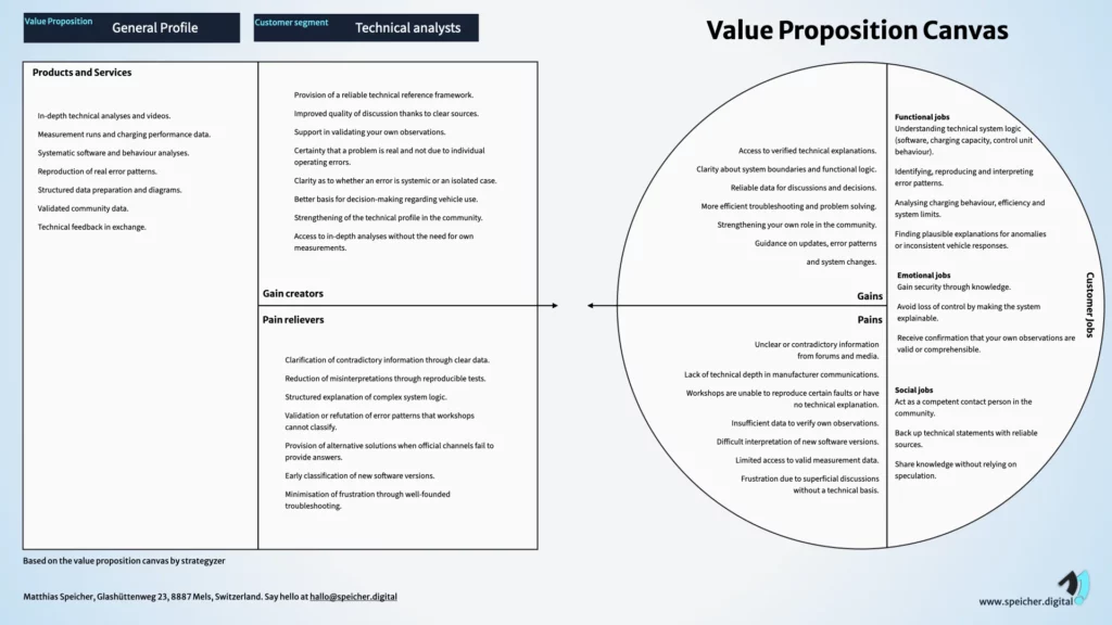 The profiles Technical Analysts and Joyful Explorers form the foundation of the Value Proposition for Speicher elektrisiert. Their different jobs, pains and gains define how content is structured, explained and prepared.