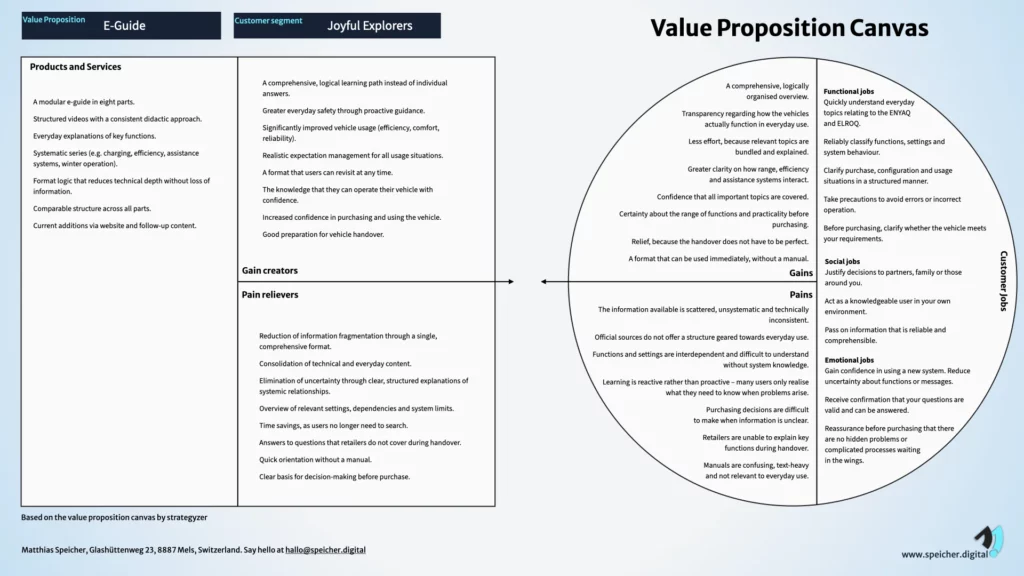 This article explains the logic behind the e-guide. It shows why a structured, modular knowledge format became necessary, which user needs it addresses and how the Value Proposition Canvas describes how the product works. The e-guide is not a classic information video, but a systematic learning format for ENYAQ and ELROQ.